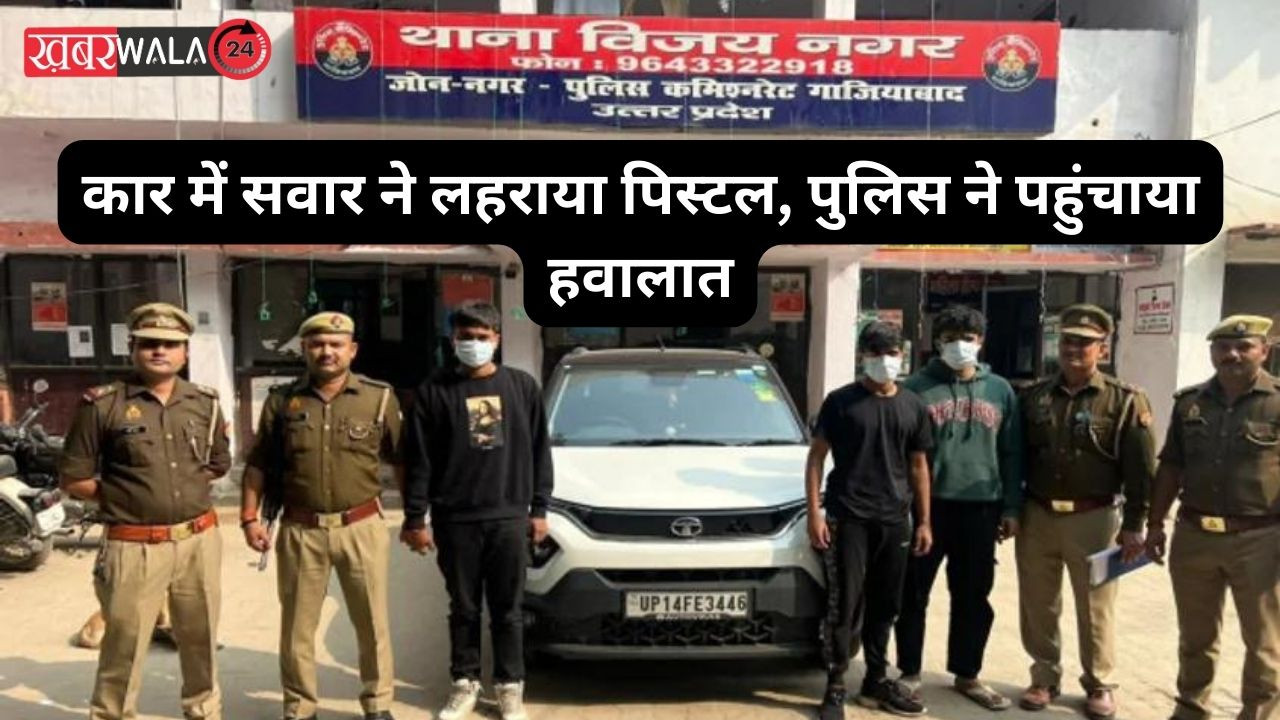 Ghaziabad News Khabarwala 24 News Ghaziabad : यूपी के जनपद गाजियाबाद में राष्ट्रीय राजमार्ग -9 पर एक गाड़ी से सवार चार युवक सवार होकर जा रहे थे। इस बीच गाड़ी की खिड़की से हाथ में पिस्टल हवा में लहराते शख्स की किसी ने वीडियो बनाकर सोशल मीडिया पर शेयर कर दिया। वीडियो जमकर शेयर हुआ। पुलिस ने मामले की छानबीन कर चारों आरोपियों को दबोच लिया और गाड़ी व पिस्टल भी कब्जे में ले ली है।