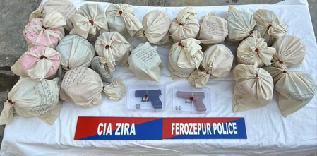पंजाब पुलिस महानिदेशक गौरव यादव ने सोशल मीडिया प्लेटफॉर्म एक्स पर बताया कि एक बड़ी सफलता में फिरोजपुर पुलिस ने नशीले पदार्थों और हथियारों के एक गिरोह का भंडाफोड़ करते हुए 4 आरोपियों को गिरफ्तार किया। आरोपियों के पास से 22 किलोग्राम हेरोइन, 2 ग्लॉक पिस्तौलें (मैगजीन और कारतूस सहित), एक कार और 2.05 लाख रुपए की नशीले पदार्थों की रकम बरामद की।
