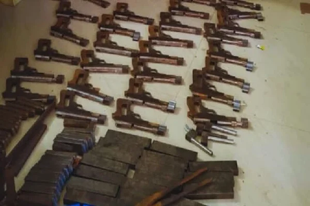 टीम ने मौके से हथियार बनाने वाले छह कारीगरों को गिरफ्तार किया है। पुलिस अधिकारियों ने बताया कि छापेमारी के दौरान फैक्ट्री से बड़ी संख्या में तैयार और अर्धनिर्मित हथियार बरामद किए गए हैं। इनमें देशी कट्टे, रिवॉल्वर, पिस्टल के पार्ट्स और कई तरह के हथियारों के बैरल एवं कैलिबर सामग्री शामिल हैं।