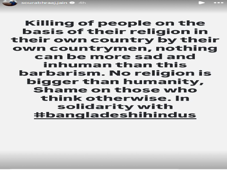सौरभ ने इंस्टाग्राम पर एक पोस्ट साझा किया है, जिसमें लिखा है, “एक देश में धर्म के आधार पर लोगों की हत्या, अपने ही देशवासियों द्वारा की गई हत्या, इससे अधिक दुखद और अमानवीय कुछ नहीं हो सकता। कोई भी धर्म मानवता से बड़ा नहीं है। जो लोग ऐसा सोचते हैं, उन पर धिक्कार है। बांग्लादेशी हिंदुओं के साथ एकजुटता में हम साथ हैं।”