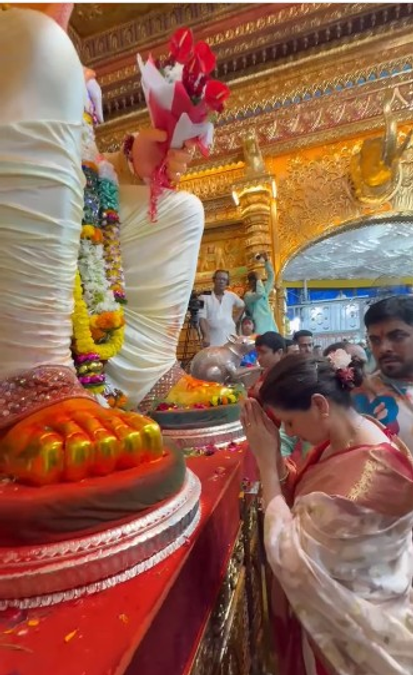 अभिनेत्री ने इंस्टाग्राम पर वीडियो पोस्ट कर कैप्शन में लिखा, श्री गणेश देवा। सुखकर्ता दुखहर्ता वार्ता विघ्नाची नूर्वी पूर्वी प्रेम कृपा जयाची सर्वांगी सुन्दर उटी शेंदु राची कंठी झळके माल मुकताफळांची जय देव जय देव जय मंगल मूर्ति दर्शनमात्रे मनःकमाना पूर्ति। जय देव जय देव रत्नखचित फरा तुझ गौरीकुमरा चंदनाची उटी कुमकुम केशरा। हीरे जडित मुकुट शोभतो बरा रुन्झुनती नूपुरे चरनी घागरिया जय देव जय देव जय मंगल मूर्ति दर्शनमात्रे मनःकमाना पूर्ति जय देव जय देव।