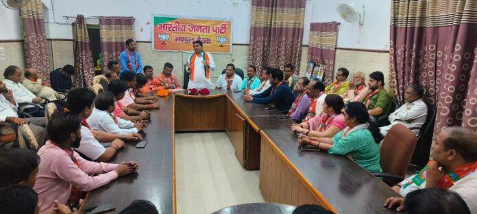 Bjp News Khabarwala 24 News Hapur: भाजपा जिला अध्यक्ष नरेश तोमर ने चैंबर ऑफ कॉमर्स में भाजपा नगर मंडल दक्षिण के पदाधिकारियों और कार्यकर्ताओं को संबोधित किया। उन्होंने वोटर चेतना अभियान को सफल बनाने का आह्वान किया।