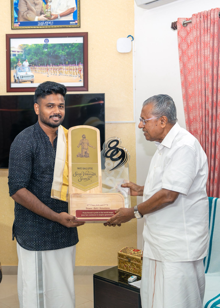 इस समारोह में 31 वर्षीय संजू पारंपरिक पोशाक पहनकर आए थे, उन्हें मुख्यमंत्री पिनाराई विजयन ने एक यादगार तोहफा दिया, जिस पर लिखा था, “हम संजू विश्वनाथ सैमसन को सलाम करते हैं।” इस यादगार तोहफे में टूर्नामेंट के नॉकआउट दौर में संजू की अहम पारियों (97*, 89, 89) का जिक्र है।