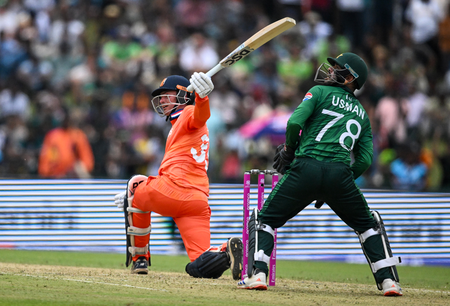 मैक्स ओ’डॉउड 7 गेंदों में 1 चौके के साथ 5 रन बनाकर आउट हुए, जबकि लेविट ने 15 गेंदों में 1 छक्के और 3 चौकों के साथ 24 रन की पारी खेली। नीदरलैंड की टीम 31 के स्कोर तक दोनों सलामी बल्लेबाजों के विकेट गंवा चुकी थी। यहां से बास डी लीडे ने कॉलिन एकरमैन के साथ तीसरे विकेट के लिए 22 गेंदों में 34 जुटाते हुए टीम को संभालने की कोशिश की।