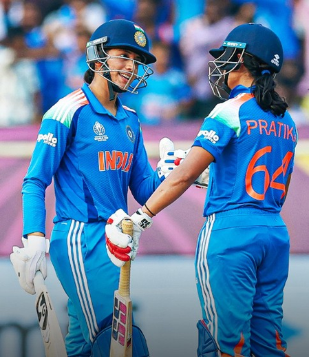 दोनों ने पहले विकेट के लिए 24.3 ओवर में 155 रन की साझेदारी की। प्रतिका रावल ने 96 गेंद पर 10 चौकों और 1 छक्के की मदद से 75 रन की पारी खेली। वहीं, मंधाना ने 66 गेंद पर 3 छक्के और 9 चौके लगाते हुए 80 रन की पारी खेली। इन दोनों का विकेट एक के बाद एक कर गिरा। मंधाना ने इस पारी के दौरान इतिहास रचा। वह एक कैलेंडर इयर में वनडे में 1,000 रन बनाने वाली महिला क्रिकेट की पहली बल्लेबाज बन गई हैं।