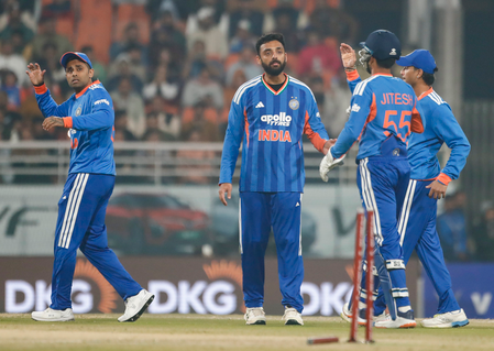 अहमदाबाद, 19 दिसंबर (khabarwala24)। भारत ने शुक्रवार को नरेंद्र मोदी स्टेडियम में खेले गए पांचवें टी20 मैच को 30 रन से अपने नाम किया। इसी के साथ टीम इंडिया ने टी20 सीरीज 3-1 से अपने नाम की। शानदार प्रदर्शन के लिए हार्दिक पंड्या को ‘प्लेयर ऑफ द मैच’, जबकि वरुण चक्रवर्ती को ‘प्लेयर ऑफ द सीरीज’ चुना गया।