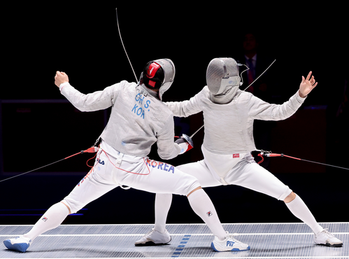 प्रत्येक टच पर एक अंक दिया जाता है। प्रत्येक मुकाबले को तीन मिनट के तीन राउंड में खेला जाता है। प्रत्येक राउंड के बीच एक मिनट का ब्रेक होता है। अगर कोई तलवारबाज पिस्ट के अंतिम छोर से बाहर पैर रख दे, तो भी प्रतिद्वंद्वी को अंक दिया जाता है।
