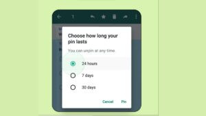 इस फीचर के साथ किसी भी मैसेज को सभी ग्रुप मेंबर्स के ध्यान में लाने के लिए कम से कम 24 घंटों तक पिन किया जा सकता है। हालांकि, वॉट्सऐप यूजर के पास 24 घंटों के अलावा, एक हफ्ते और 30 दिन का भी ऑप्शन मौजूद है।