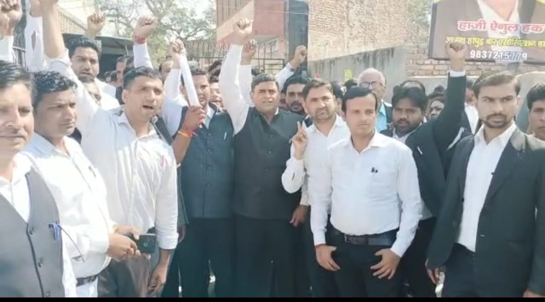 खबरवाला 24 न्यूज हापुड़ : हापुड़ बार एसोसिएशन के अधिवक्ताओं ने पुलिस पर एक अधिवक्ता के साथ अभद्रता कर मारपीट करने का आरोप लगाया है। इसको लेकर अधिवक्ताओं ने आक्रोष व्याप्त हो गया। शुक्रवार को अधिवक्ताओं ने कचहरी गेट पर धरना देकर जोरदार प्रदर्शन किया। दोषी पुलिस कर्मियों के खिलाफ सख्त कार्रवाई किए जाने की मांग की।
