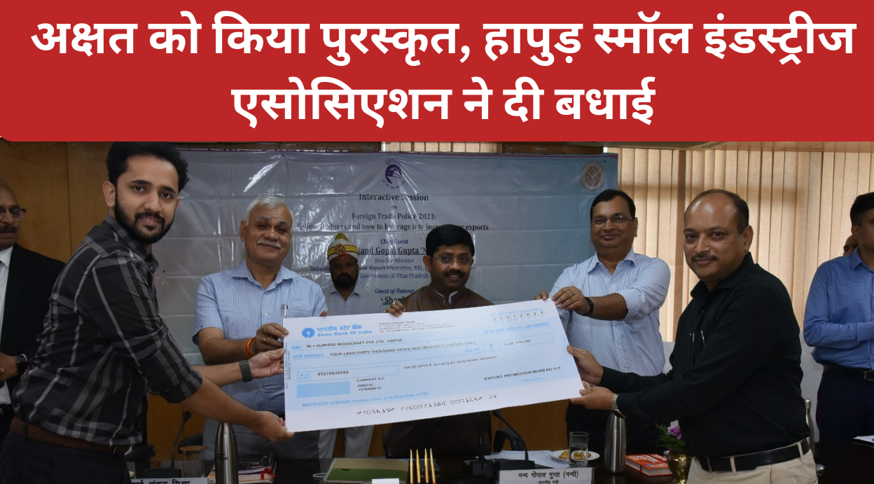 Hapur News Khabarwala24 News Hapur : युवा उद्यमी अक्षत गर्ग को लखनऊ में आयोजित कार्यक्रम में निर्यात करने पर पुरस्कार से सम्मानित किया गया। इस पर हापुड़ स्माॅल इंडस्ट्रीज एसोसिएशन के पदाधिकारियों और सदस्यों ने बधाई दी गई।