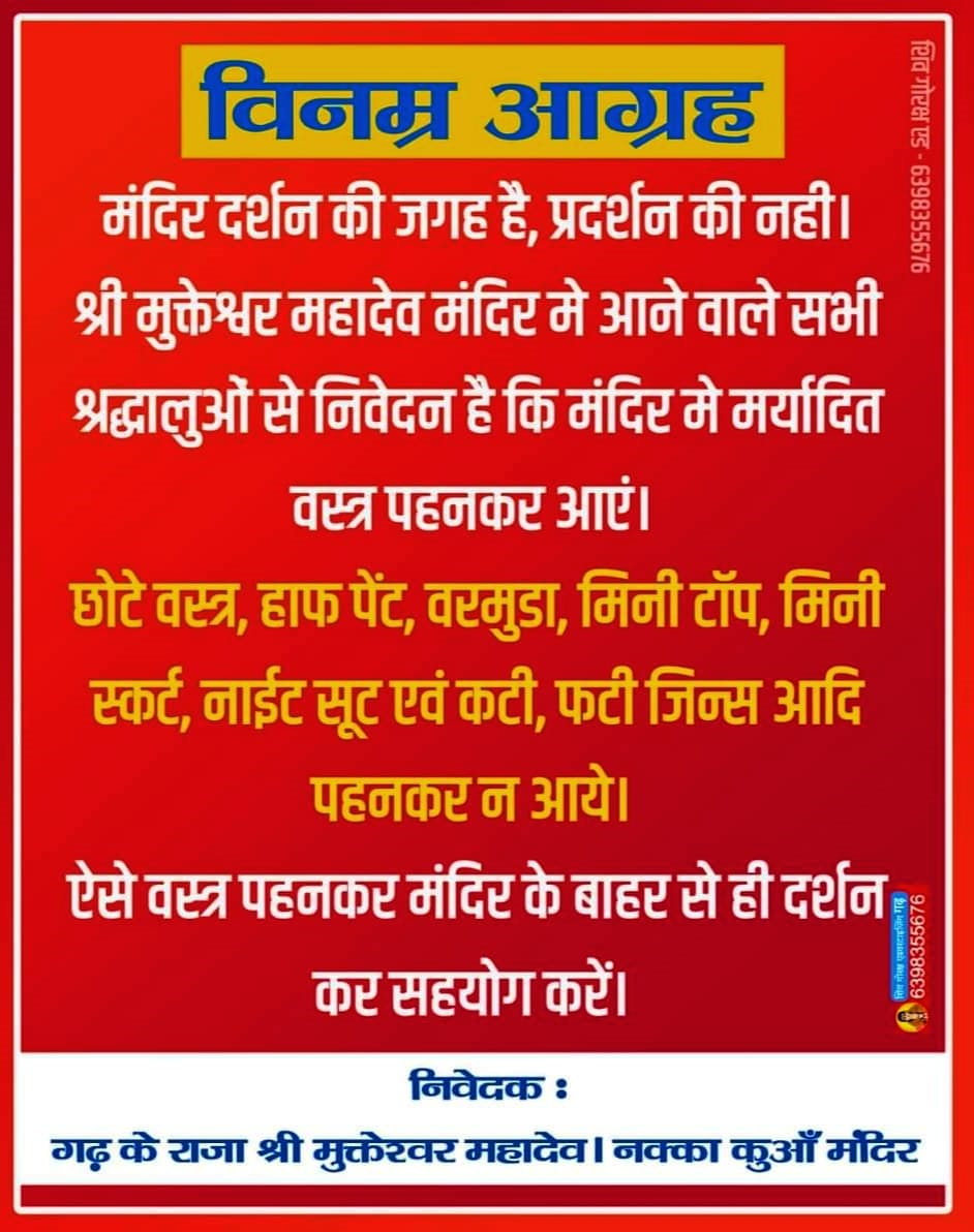 हापुड़ नगर के मंडी पाटिया स्थित खाटू श्याम मंदिर के बाद अब गढ़ नगर के प्रसिद्ध मुक्तेश्वरा महादेव नक्का कुंआ मंदिर में भी श्रद्धालुओं से मर्यादित कपड़े पहनकर आने की अपील की गई है। कमेटी की तरफ से मंदिर के बाहर नोटिस भी चस्पा कर दिया गया है। इस पहल को श्रद्धालुओं ने सराहा है। कमेटी की ओर से चस्पा नोटिस व पोस्टर में अपील की गई है कि मंदिर में छोटे कपड़े, हाफ पैंट, मिनी टाप, मिनी स्कर्ट, नाइट सूट, कटी-फटी जींस पहनकर परिसर में प्रवेश न करें।