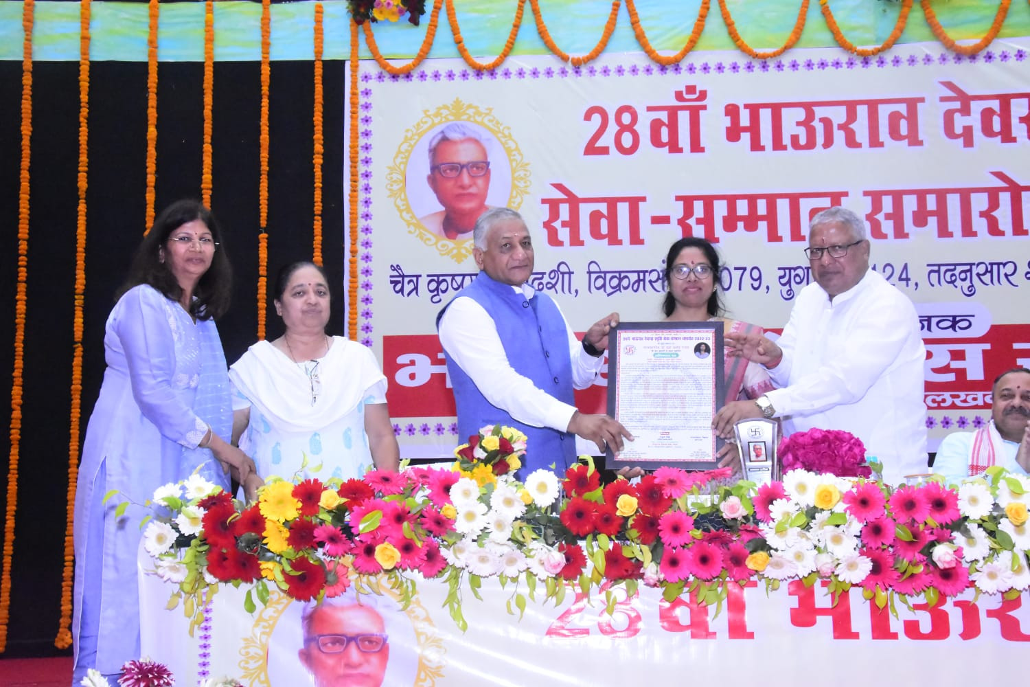 Khabarwala24NewsHapur (Mrs. Brahma Devi) सरस्वती बालिका विद्या मंदिर परिसर में 28 वें भाऊराव देवरस स्मृति सेवा सम्मान समारोह का आयोजन हुआ। कार्यक्रम में मुख्य अतिथि केंद्रीय राज्यमंत्री जनरल वीके सिंह और सांसद राजेंद्र अग्रवाल ने भाऊराव देवरस के द्वारा समाज के लिए किए गए कार्यों की सराहना की और श्रीकृष्ण शांति निकेतन नागपुर से जुड़ी डाक्टर प्रज्ञा प्रमोद राऊत को सम्मानित किया।