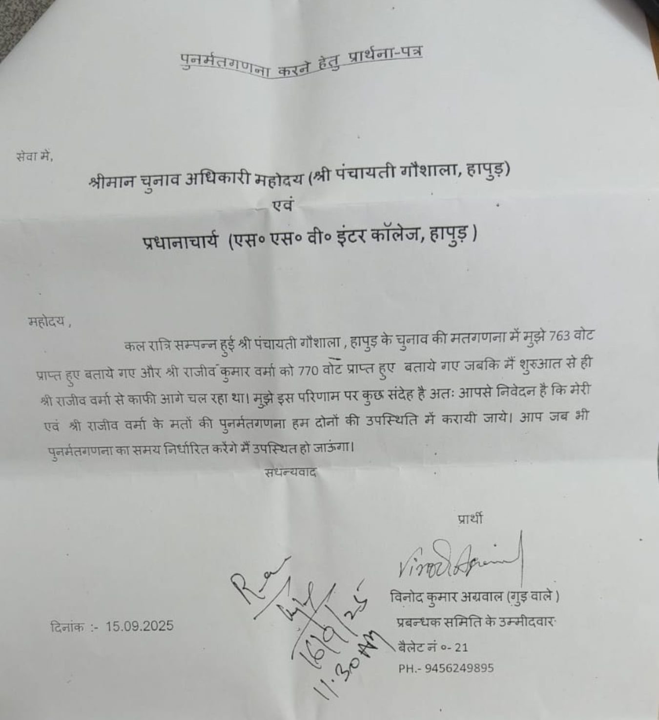 Khabarwala 24 News Hapur: यूपी के जनपद हापुड़ (Hapur) की श्री पंचायती गोशाला के कार्यकारिणी चुनाव में मतगणना में धांधली का गंभीर आरोप सामने आया है। कार्यकारिणी के लिए 23वें स्थान पर रहे और चुनाव हारे प्रत्याशी विनोद कुमार अग्रवाल ने जिला मजिस्ट्रेट (डीएम) और चुनाव अधिकारी को शिकायत पत्र सौंपकर मतगणना में अनियमितता का दावा किया है। उन्होंने अपने और अन्य प्रत्याशी के मतों की पुनर्मतगणना की मांग की है, ताकि परिणाम की पारदर्शिता सुनिश्चित हो सके।
