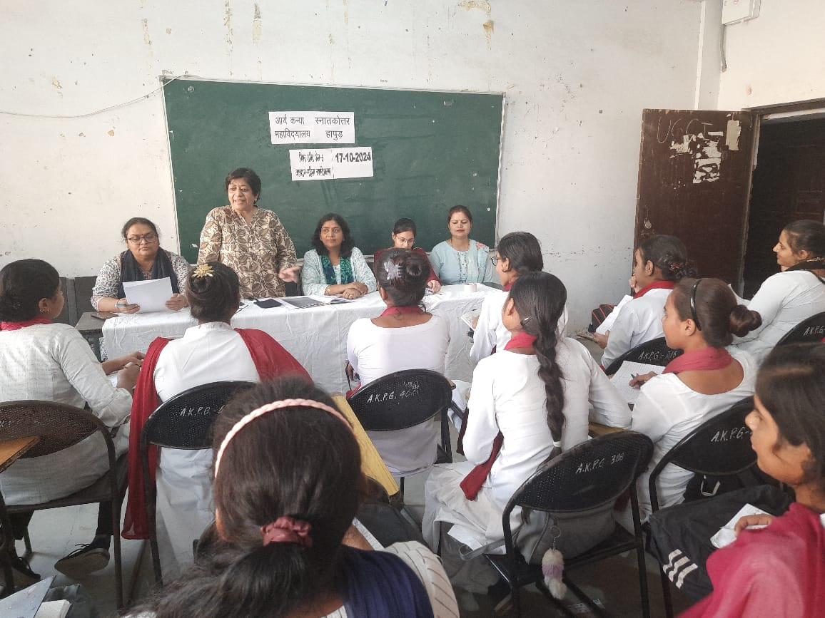 Khabarwala 24 News Hapur: Hapur आर्य कन्या स्नातकोत्तर महाविद्यालय में शासन द्वारा निर्गत आदेश के अनुपालन में ‘मिशन शक्ति फेस- 5’ कार्यक्रम के अंतर्गत प्रोफेसर मनीला रोहतगी के नेतृत्व में एक संगोष्ठी का आयोजन किया गया। छात्राओं को मानसिक एवं शारीरिक रूप से सशक्त बनाने के लिए शिक्षा एवं स्वास्थ्य दोनों ही अति आवश्यक है।
