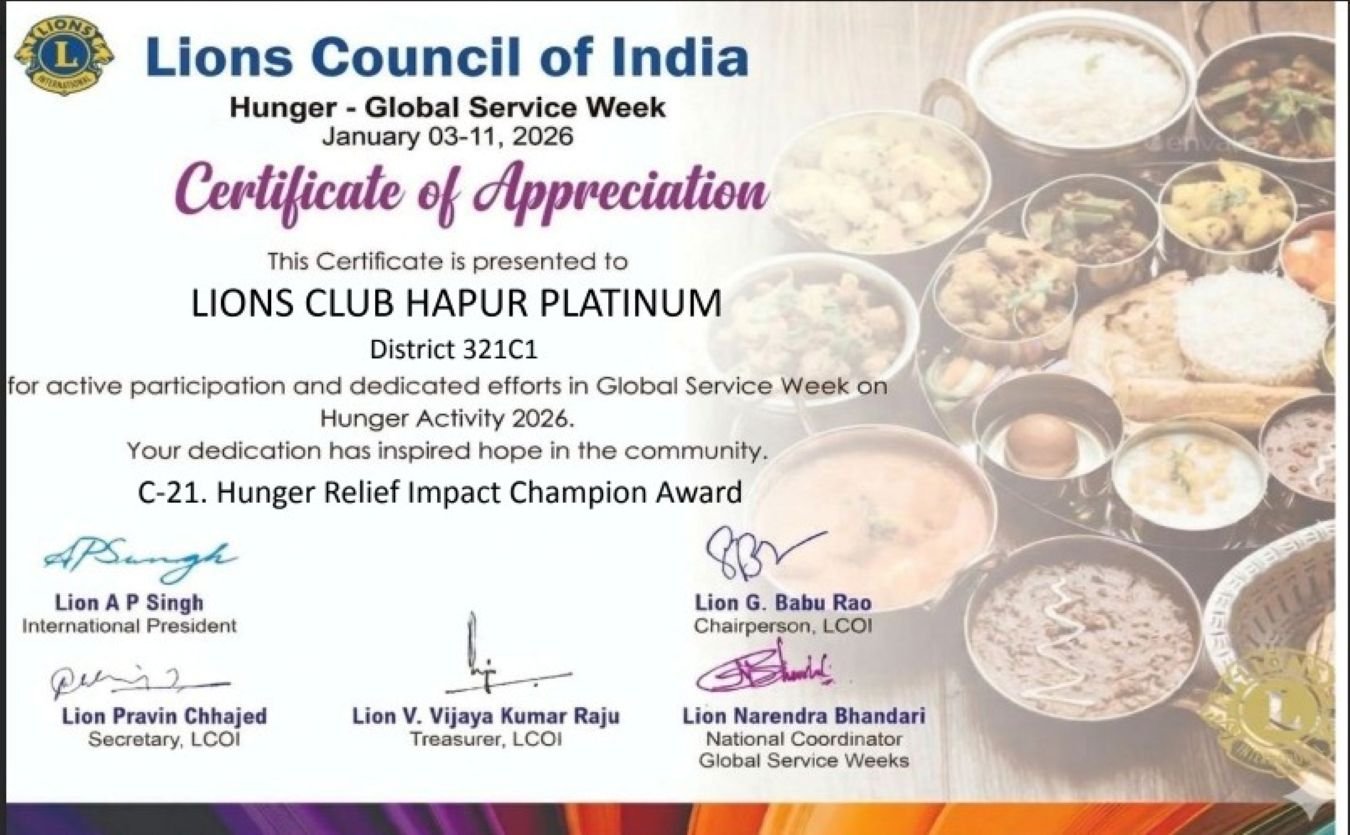 Khabarwala 24 News Hapur: Hapur News समाज सेवा के क्षेत्र में निरंतर कार्यरत Lions Club Hapur Platinum को भूखमरी उन्मूलन में किए गए उत्कृष्ट प्रयासों के लिए “Hunger Relief Impact Champion Award” से सम्मानित किया गया। यह सम्मान Lions Council of India द्वारा आयोजित Global Service Week (3 से 11 जनवरी 2026) के अंतर्गत प्रदान किया गया।