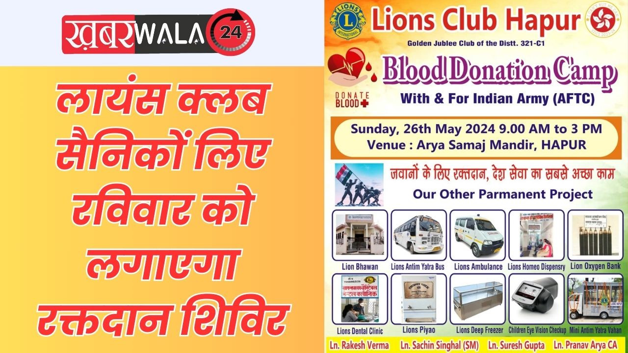 Khabarwala 24 News Hapur : Lions Club देश की रक्षा करने के लिए सेना में शामिल होकर कुछ कर गुजरने की चाह हर भारतीय में होती है, लेकिन इसमें शामिल होने का मौका सबको नहीं मिल पाता। बेशक सभी युवा बॉर्डर पर नहीं जा पाते, लेकिन वे अन्य माध्यमों से भी देशसेवा कर सकते हैं। इसी जज्बे के साथ रविवार को आर्य समाज मंदिर में लायंस क्लब हापुड़ द्वारा रक्तदान शिविर का आयोजन किया जा रहा है।