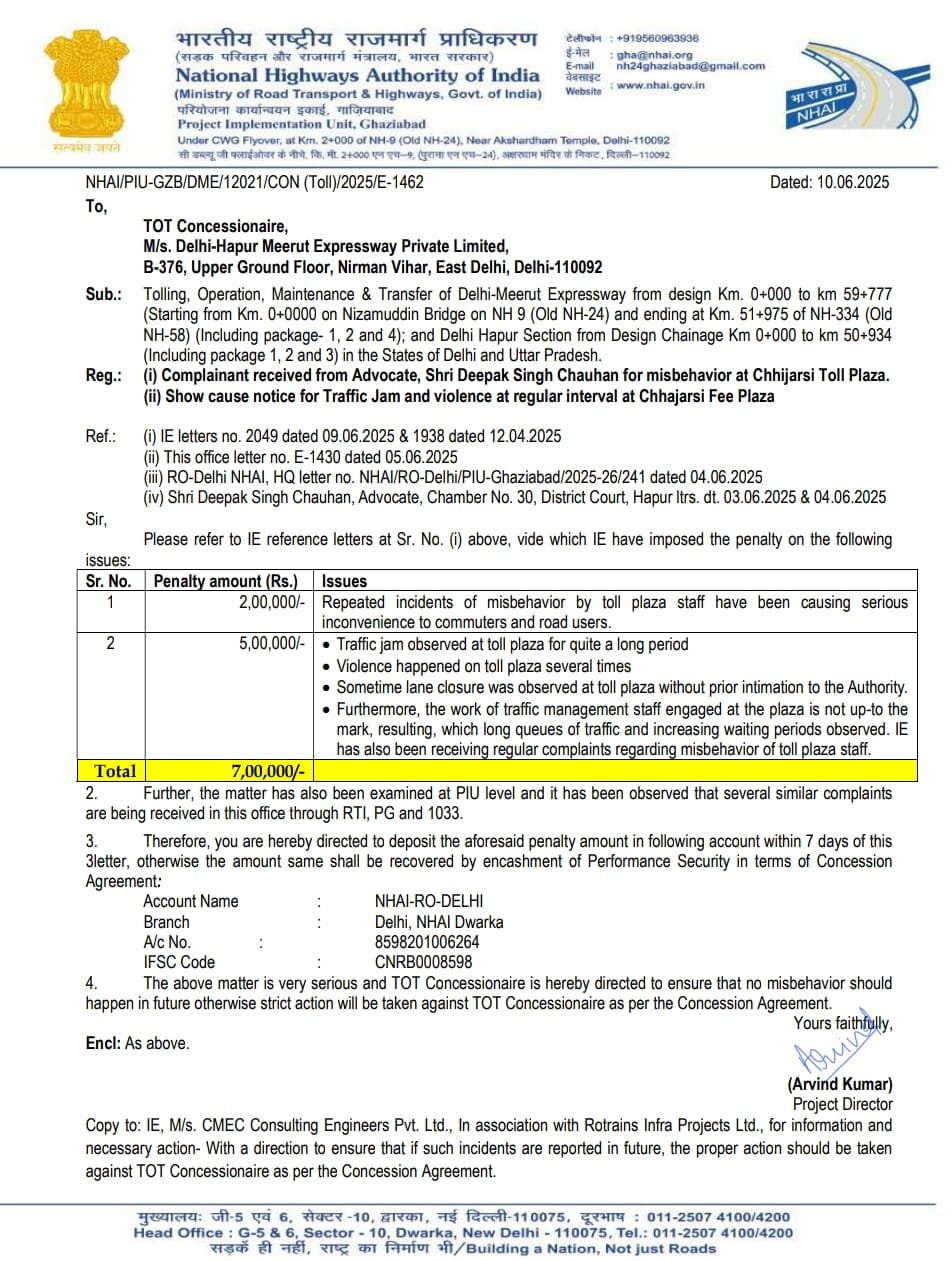 इसके बाद NHAI ने टोल संचालक कंपनी पर 7 लाख रुपये का जुर्माना लगा दिया। जिसमें आए दिन जाम लगने पर भी जुर्माना लगाया गया है। साथ ही चेतावनी दी कि अगर समय पर जुर्माना नहीं भरा गया, तो नोटिस जारी किया जाएगा।