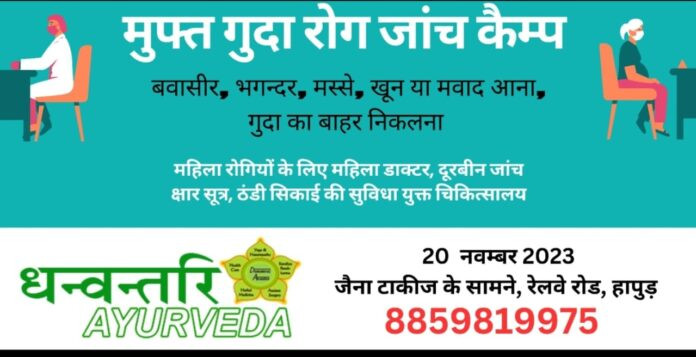 Testing Camp Khabarwala 24 News Hapur : रेलवे रोड पर जैना टाकिज के सामने 20 नवंबर को धन्वन्तरि आयुर्वेदा पर निश्शुल्क गुदा रोग जांच शिविर का आयोजन किया जाएगा।